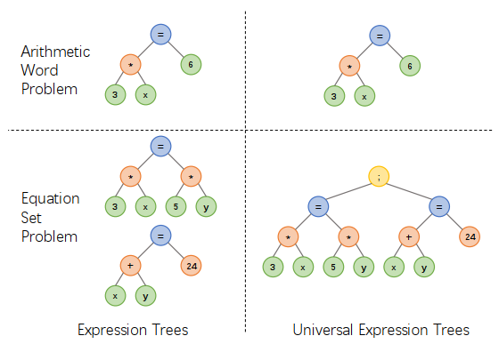 针对上述问题,中山大学人机物智能融合实验室团队提出一种统一表达式树表示方案,通过引入额外的运算符连结多个表达式,将一元一次方程,二元一次方程组,一元二次方程等类型的表达式进行统一表示,从而可以简化求解器的设计的同时也可以求解多种类型的应用题,如图 1 所示。