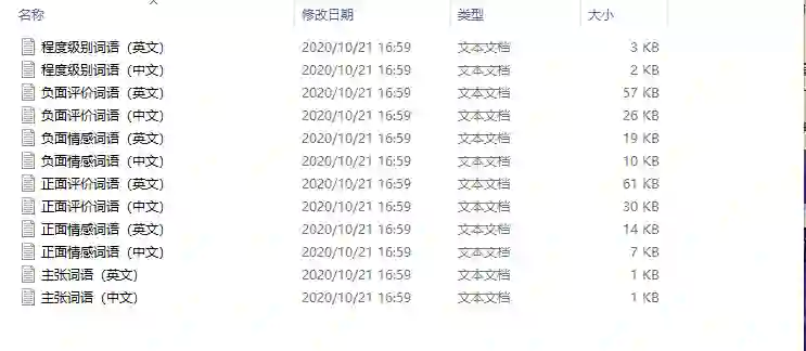 这份中英文情感分析用语词集包含了约17887个词语。其中包含正面情感、负面情感、正面评价、负面评价、程度级别、主张六个子类。
