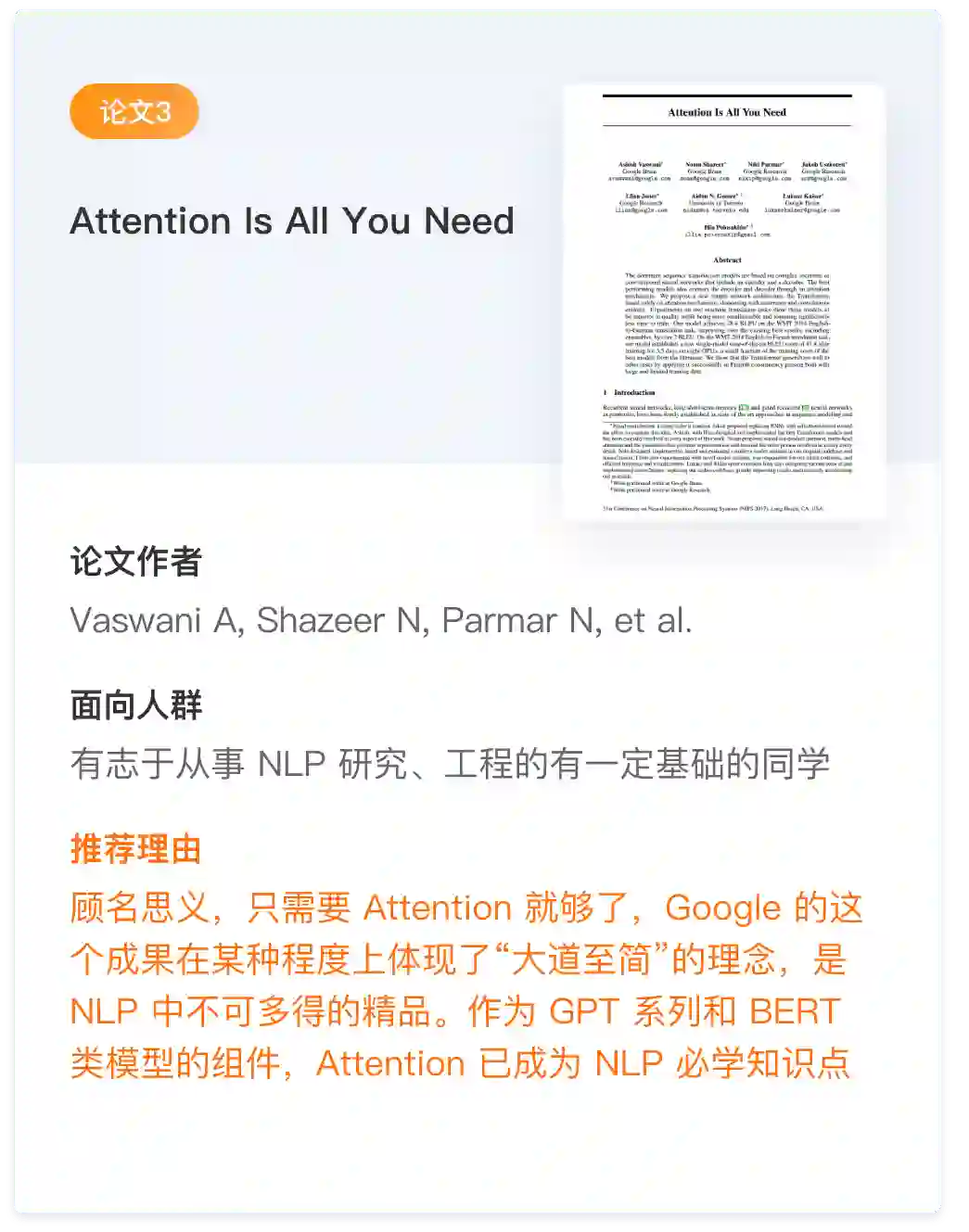 这5篇论文包含了情感分析的各个领域,并且有情感分析领域最具影响力的学者之一的刘兵老师。NLP 必学知识点BERT 、 GPT 、Attention 、 CBOW 、 Skip-Gram 、还包含了几种优化方法:Hierarchical Softmax、Negative Sampling 、Subsampling 技术。这些论文将给你的NLP情感分析奠定了理论基础。