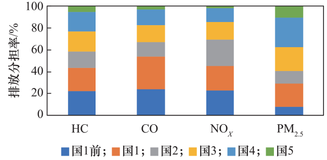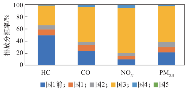 图 3 和图 4 展示了轻型汽油客车和重型柴油货车分技术排放分担率。轻型汽油客车的各项排放标准的构成呈现较为平均分配的状态,国 4 车虽然保有量占比超过 50%,但是由于单车排放水平较低,只贡献约 10%~30% 的污染物排放;国 1 前车辆的保有量只占轻型车的不到 5%,却贡献了将近 20% 的污染物排放,占据保有量 10% 左右的国 1车也贡献了 20% 以上的排放量 [4]。因此,针对小型客车的控制,需要加强黄标车的淘汰进程以及对国 1 前和国 1 老旧高排放车辆的淘汰速度。