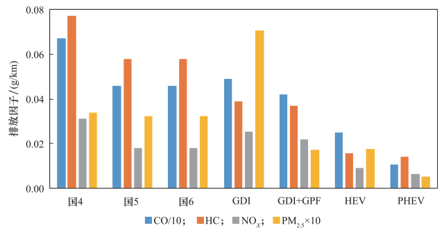 对于轻型车,欧盟为了在降低污染物排放的同时提高燃油经济性的效益,欧 V 排放标准对燃油经济性提出了更高的要求,引入了可变气门正时(VVT)技术、汽油机缸内直喷(GDI)和涡轮增压等先进节能控制技术 [6]。其中,GDI 技术可以实现燃油经济性的大幅改善,但排放出的 PM2.5 比传统的多点喷射汽油车高 [7],因此,欧 V 排放标准特别针对采用 GDI 技术的汽车规定了 PM2.5 的排放限值 [8]。欧 VI 标准则进一步加强了对颗粒物排放的控制,规定采用 GDI 技术的汽车需要加装汽油机颗粒物捕集器(GPF)以降低 PM 2.5 排放量 [9]。