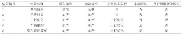 结合上文中所述车辆保有量与单车排放因子的趋势分析,本研究针对各污染物类型的未来排放趋势开展了研究。针对中国汽车环境协同发展面临的主要问题,本研究提出未来实现汽车环境协同发展的汽车排放控制措施,设置了「基准情景」「排放严格」「出行优化」「车辆限购」和「引入新能源车」5 个逐渐严格的排放控制情景。各排放控制情景具体的控制措施如表 1 所示。