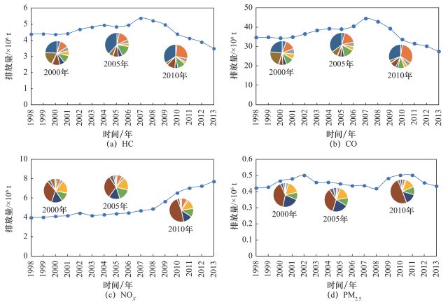 对于 PM2.5,从 2002 年到 2008 年的排放总量存在明显下降,与 HC 和 CO 的同期趋势形成明显反差。但是在 2009 年至 2011 年期间,PM 2.5 排放量出现了短暂的反弹,究其原因主要在于国际金融危机期间我国实施的经济鼓励政策对柴油货车的销量产生了刺激作用。随着柴油货车的保有量逐渐稳定,国 3 货车开始进入市场,机动车的 PM 2.5 排放总量随后开始快速下降,年均降幅高达 8%。最后,与其他 3 种污染物排放趋势不同,NOX 的排放量从 1998 年到 2013 年持续上升,一直未出现下降,且增长速度在近年逐渐加快,机动车 NOX 排放总量从 2008 年到 2013 年的年增长率高达近 10%。