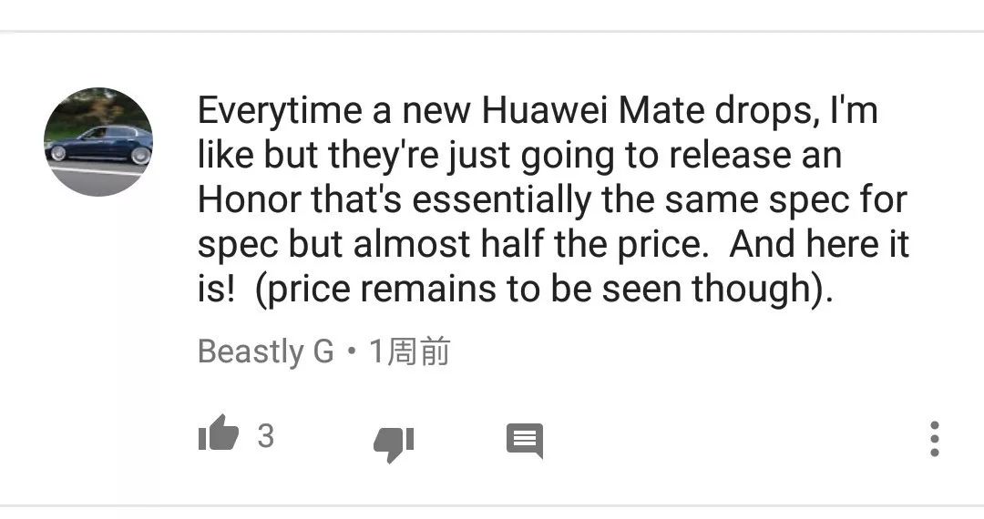 翻译:每次一部 Mate 系列发布我都挺喜欢,但他们很快就会再发一台规格差不多,但价格却少一半的机子(荣耀)