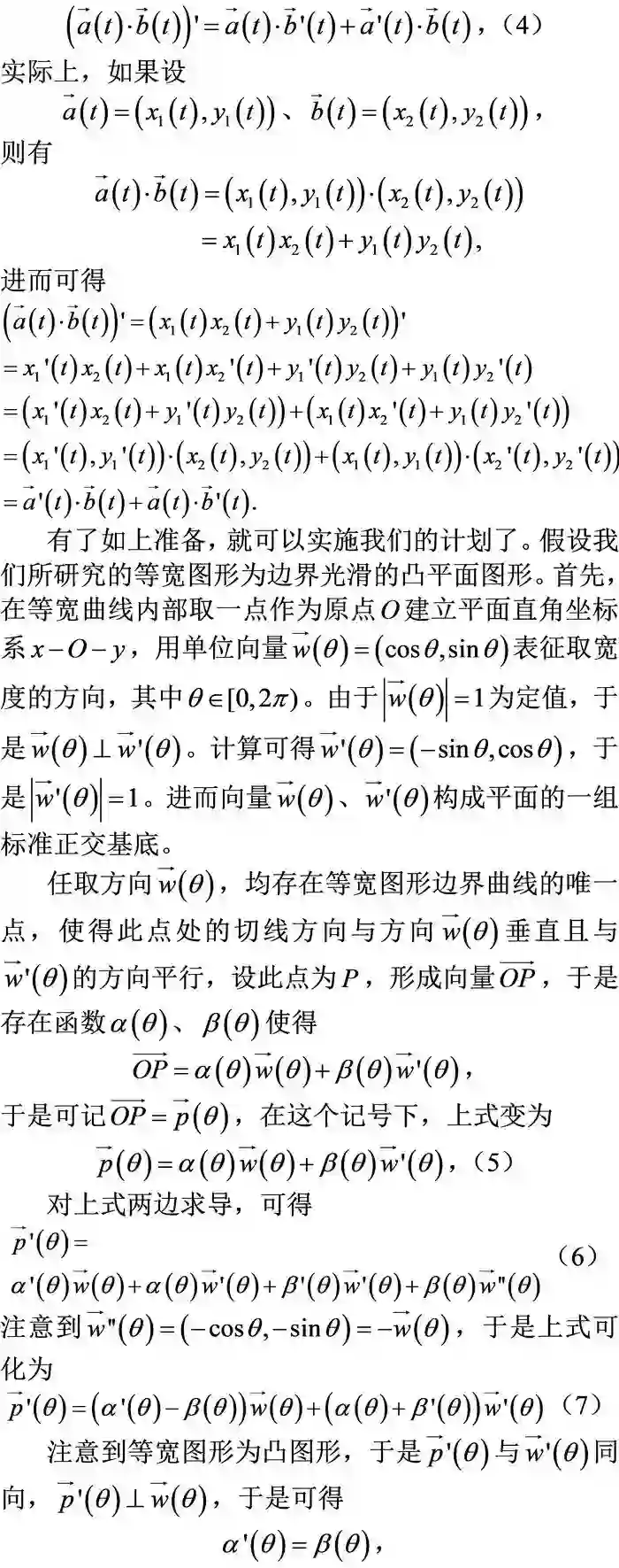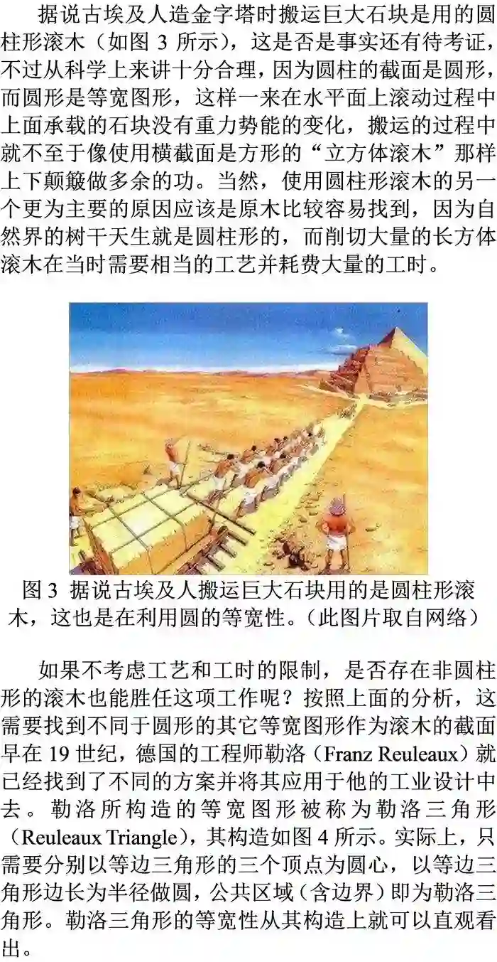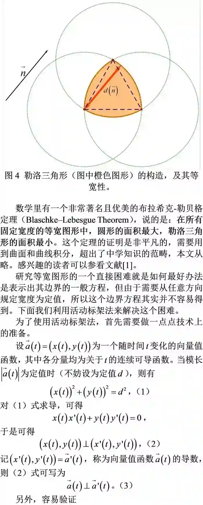 有很多非常深刻的数学方法,都是根植于问题的解决策略中。日常生活中常见的井盖、造金字塔时所用的滚木搬运法,不仅蕴含着“等宽图形”这种概念,而且其典型的研究方法就是近代几何中非常重要的活动标架法——陈先生曾经用此方法给出了高斯-博纳公式的内蕴证明,本文将从更初等的角度,以平面上等宽图形这一生活中常用图形为载体,在高中知识范围内去解释活动标架法的奇妙作用。