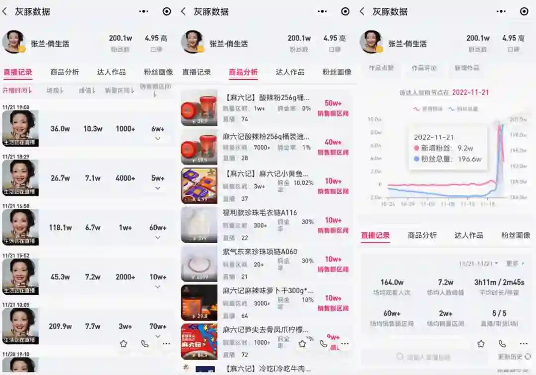 11月21日,张兰在抖音开启了五场直播,最早的一场在上午10:05开播,最晚的一场在晚上19:00开播,截至目前,张兰的抖音账号涨粉超过12万。灰豚数据显示,五场直播GMV超过150万元,39.9元的酸辣粉卖出了10000多份,贡献50多万元GMV;4.99元的小黄鱼卖出了30000多份,贡献10多万元GMV——对比前7天的数据,张兰此前的直播带货金额在10—20万元不等,11月20日的带货GMV约20万元,21日增长了近7倍。