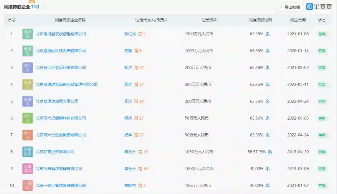 如今,根据企查查数据显示,无论是俏江南股份有限公司,还是北京俏江南投资控股有限责任公司,其股东名单里均未出现汪小菲和张兰。汪小菲的微博认证里只留下“北京食通达科技发展有限公司董事长、麻六记品牌创始人”。而北京食通达科技发展有限公司,正是北京麻六记餐饮管理有限公司、北京粤洱堂餐饮管理有限公司的股东——这两个熟悉的名字:麻六记、粤洱堂,则是汪小菲在2020年、2021年分别创办的川菜品牌和粤菜品牌。