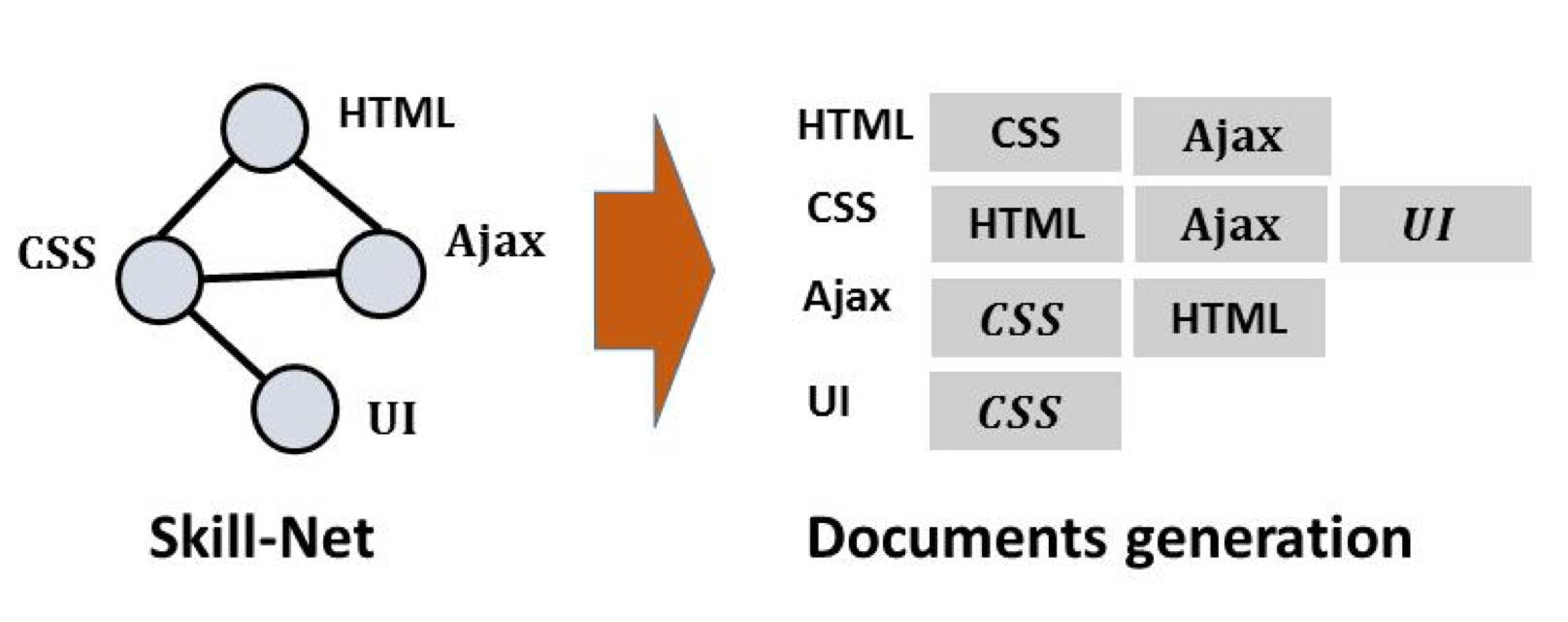 具体而言,首先基于技能在招聘需求中的共现度,构建了用于表示技能间关联性的网络(Skill-Net),接着将每个技能构成的自我网络(ego-network)当作文档,相邻技能节点作为单词进行建模。