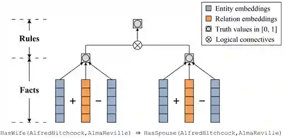 Rocktaschel等人设计了一个类似于KALE的模型。然而,在他们的工作中,是为实体对而不是单个实体引入向量嵌入,使其特别适用于关系提取。由于实体确实没有自己的嵌入关系,无法有效地发现未配对实体之间的关系。[34]和[35]两者有一个共同的缺点:在学习它们的模型之前,它们必须将普遍量化的规则实例化为基本规则。该基本的过程可能在时间和空间上效率极低,尤其当KG中存在大量的实体且规则本身是复杂时或者规则本身是复杂时。要解决此问题Demeester等人的缺点[111]最近提出了[35]的扩展,其核心思想是利用逻辑正则化关系嵌入的影响避免接地。例如,给定一个普遍量化的规则