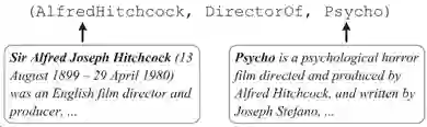 本节讨论对实体的文本描述的集成。实际上,在大多数KGs中,对于包含丰富语义信息的实体,有简明的描述。图8显示了在FreeBase中对AlfredHitchcock和 Psycho描述信息。此外,实体描述除了存储在KGs以外,它还可以扩展到结合更多的一般文本信息,如发布的新闻和维基百科文章。