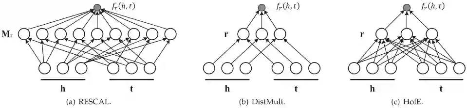 其他相关学习方法的说明。另一条研究思路是将KG嵌入与其他关系结合在一起。例如,路径排序算法(PRA),它是采用不同类型的算法的方法。Dong等人提出了通过融合系统将MLP与PRA相结合的方法。具体地, 在分别对这两种模型进行拟合后,它们使用MLP和PRA的输出作为标量特征,通过训练二分类器学习一个最终的融合层。他们发现融合这两种模型能够改善性能:融合系统的结果是:ROC曲线下的面积为0.911,而PRA是0.882 和MLP是0.884。Nickel等设计了一个通用框架,将潜在变量模型和可观测变量模型结合起来。特别是,如果将Rescal与PRA结合,则评分函数变为: