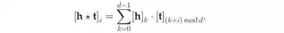 HolE模型。HolE将RESCAL的表达能力与DistMult的效率和简单性相结合。它把实体和关系都表示为R_d中的向量。给定一个事实(h,r,t),首先使用循环相关操作将实体表示形式组成h*t∈R