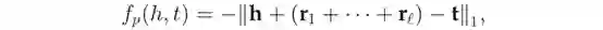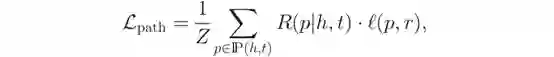 这里,c_i表示第i个关系的累积路径向量;W是由所有关系共享的组合矩阵。[c_i-1;r_i]表示c_i-1和r_i的级联;f是一个非线性函数。通过设置c_1=r_1和递归地从左到右遍历,最终可以得到p=c_l,然后要求路径p与两个实体之间的直接关系r一致,,即当(h,r,t)成立时,||p-r||_1趋于较小。对于每个事实,PTransE定义了关于这些路径的损失,即,