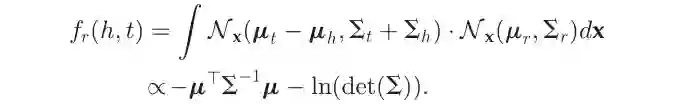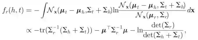 其中,μ_h、μ_r、μ_t是均值向量,∑_h、∑_r、∑_t代表协方差矩阵。然后,受到平移假设的启发,KG2E模型通过测量t-h和r这两个随机向量之间的距离来为一个事实评分,即N(μ_t-μ_h,∑_t+∑_h)和N(μ_r,∑_r)这两个分布。通过2种方法来进行测量。一种是通过KL散度(KL距离)来进行测量即: