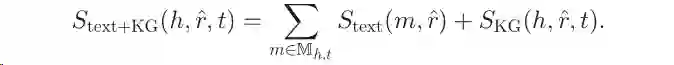 最近,Weston等人提出将TransE与基于文本的抽取器相结合的方法,以便更好地进行关系抽取。具体来说,在训练阶段,他们从文本语料库中学习一个基于文本的抽取器,并从与该语料库对齐的KG中学习一个TransE模型。基于文本的抽取器对每个关系r与其文本提及m之间的相似性进行评分,即Stext(m,r)。这些评分可以用来预测它们的文本提及的关系,即证据来自文本语料库。与此同时,TransE模型对在KG中的每个缺失的的事实(h,r,t)的合理性进行打分。这些分数可以用来预测它们与KG中实体的交互关系,即证据来自KG。在测试阶段,给定两个实体h, t,以及所有与它们相关的关系Mht,首先使用基于文本的抽取器对进行预测得到r,然后对候选事实进行一个复合的评分计算,即