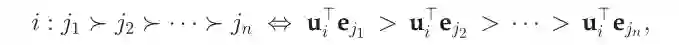 其中,sj、tj和vj分别是与该项相关联的结构表示、文本表示和视觉表示,而hj是一个偏移向量。然后将用户i对item j的偏好建模为两个潜在向量的乘积,即 uT_i*e_j。利用对优先级的排序优化来学习这些潜在向量。最后,在测试时,给定目标用户i,可以根据下面的排序标准进行item推荐: