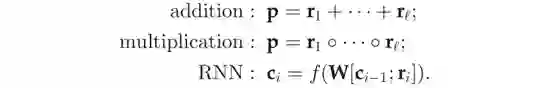关联路径长期以来一直对多关系中数据进行研究。例如,路径排序算法直接使用连接两个实体的路径作为特征进行预测它们之间可能的关联。最近,它们已将其集成到KG嵌入中。然而,主要的挑战是如何在与实体和关系相同的向量空间中表示这样的路径。一个简单的解决方案是将路径表示为关系表示的一部分,因为路径的语义取决于所有这些关系。图7提供了这个想法的简单的说明。实际上,几乎所有现有的处理关联路径的方法都是使用组合策略。典型的组合操作包括加法、乘法和递归神经网络(RNN)。