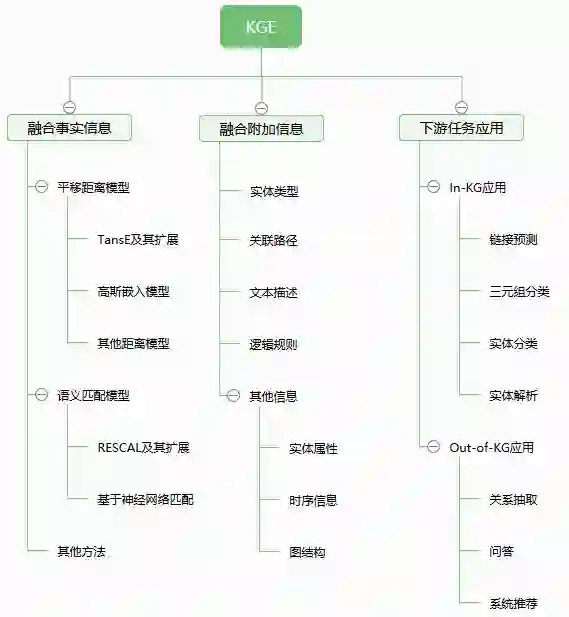 本文主要是参考《Knowledge Graph Embedding: A Survey of Approaches and Applications》和刘知远的《知识表示学习的研究与进展》做的总结,主要介绍了最近关于知识图谱嵌入所涉及到的研究方法,主要从融合事实信息、融合附加信息和KGE下游任务应用三方面展开。由于篇幅较长,下图是本文的结构,可以按照自己的需要有选择性的浏览。