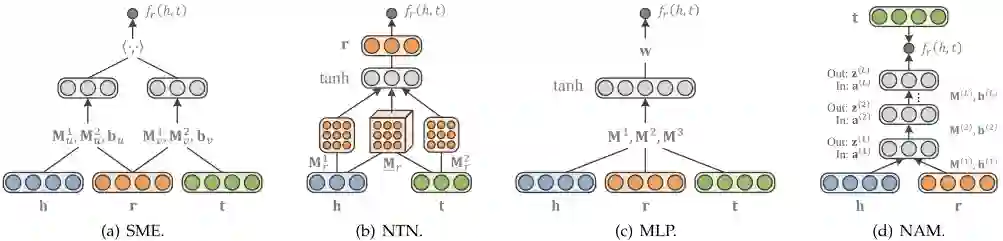 多层感知机(MLP)。MLP是一种更简单的方法,在这种方法中,每个关系(以及实体)都是由一个向量组合而成的。如图6(c)所示,给定一个事实(h,r,t)将嵌入向量h、r和t连接在输入层中,并映射到非线性的隐藏层。然后由线性输出层生成分数,即:
