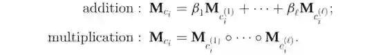其中n_h>=1是h所属的类别数;c_i是其中的第i个类别;M_ci是c_i的投影矩阵;a_i是对应的权重;C_rh是头实体可以具有的与r相关的类型集合。为了进一步处理层次类别,M_ci表示为与c_i的所有子类别关联的投影矩阵的组成。使用两种类型的合成操作,即: