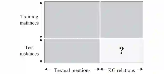Riedel et al.[21]设计了一个不同的框架,通过将纯文本和KGs联合嵌入,来实现关系提取,在他们的工作中,文本和KGs被表示在同一个矩阵中。矩阵的每一行代表一对实体,每一列代表一个提及的文本或KG关系。如果两个实体与纯文本中的一个提到或与KGs中的关系同时出现,则将相应的条目设置为1,否则设置为0。对于训练实例(实体对),我们可以同时观察文本提及和KG关系,而KG关系作为重要的监督。但是对于测试实例,只有文本提到是可用的。然后,关系提取用于预测测试实例缺少的KG关系。图7给出了这个场景的一个简单插图。本文提到,这项任务使用了协作过滤技术,它分解输入矩阵来学习实体对的向量嵌入和公斤关系。该框架还改进了传统的基于文本的提取器。Fan等[88]也提出了类似的观点关系提取方法。但在他们的工作中,第一矩阵中的一组列对应于文本特性并采用矩阵补全技术[128]代替矩阵分解技术。Chang等人[93]后来设计了一种基于张量的变体用三模张量编码纯文本和KGs,然后利用RESCAL模型分解张量。