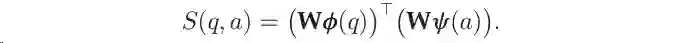 上式中W是一个包含单词、实体和关系嵌入的矩阵;Φ(q)和ψ(a)是两个稀疏向量,前者表示问题中出现的单词,后者表示答案中出现的实体和关系。