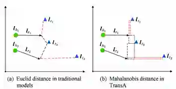 如图2所示,( h_1, r_1, t_1)和(h_2,r_2,t_2)两个合法的事实三元组,t3是错误的尾实体。如果使用欧氏距离,如图2(a)所示,错误的实体t3会被预测出来。而如图2(b)所示,TransA模型通过对向量不同维度进行加权,正确的实体由于在x轴或者y轴上距离较近,从而能够被正确预测。