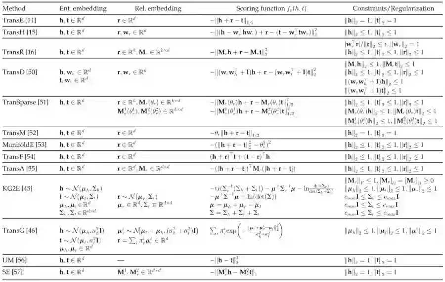 我们将这种嵌入技术大致分为两类:平移距离模型和语义匹配模型。前者使用基于距离的评分函数,后者使用基于相似度的评分函数。在这一部分中,我们介绍了这两组嵌入技术。在此基础上,对这些嵌入技术的效率和有效性进行了比较。