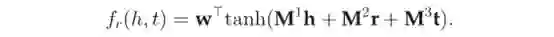 神经张量网络模型(NTN)。NTN是另外一种神经网络结构,给定一个事实,它首先将实体投影到输入层中的嵌入向量。然后,将这两个实体h,t由关系特有的张量M_r(以及其他参数)组合,并映射到一个非线性隐藏层。最后,一个特定于关系的线性输出层给出了评分,即: