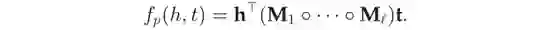 其中,t_是t的共轭和Re(·)表示取复数的实部。这个评分函数不再是对称的,来自非对称关系的事实可以根据涉及实体的顺序得到不同的分数。最近的研究表明,每个ComplEx都有一个等价的HolE,反之,是在嵌入上施加共轭对称ComplEx包含HolE的特殊情况。