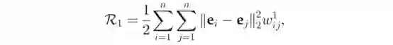 其中e_i和e_j分别是实体ei和ej的嵌入向量,如果这两个实体属于同一范畴,则w=1,否则w=0。通过最小化R_1,只要当w=1时,我们期望e_i和e_j之间距离会很小。后者表示一个实体视为其最近邻居的线性组合,即同一类别内的实体。