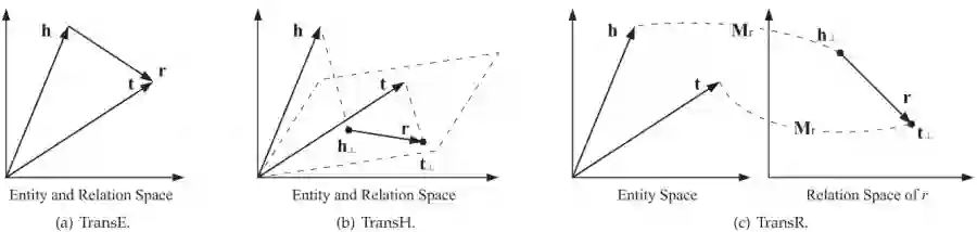 TransH模型。为了解决TransE模型在处理一对多 、 多对一 、多对多复杂关系时的局限性,TransH模型提出让一个实体在不同的关系下拥有不同的表示。如图1(b)所示,对于关系r,TransH模型同时使用平移向量r和超平面的法向量w_r来表示它。对于一个三元组(h, r, t) , TransH首先将头实体向量h和尾实体向量r,沿法线wr,影到关系r对应的超平面上,用h⊥和t⊥表示如下: