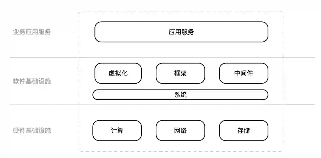 随着企业大量使用公有云,IaaS/PaaS甚至SaaS都被服务化了,通过API就可以简单的获取;大量的运维建设工作由云厂商帮忙完成了,比如硬件、系统、网络、数据库、大数据等,原厂只需要保留少量的专业选型和集成能力(外包)。