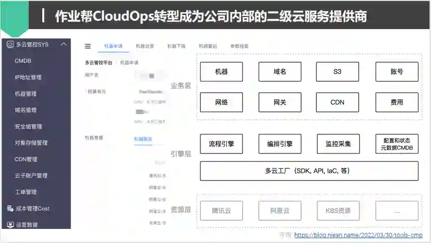 之后我们开始建设多云管理平台。多云管理平台主要结构就是上图里的中间部分,分为资源层、引进层和业务层,管理各种云服务的生命周期,多云管理平台对内提供了机器、带宽、对象存储、CDN等多种能力,CloudOps也成功转型为公司内部的二级云服务提供商。这处在洋葱模型的第二阶段。