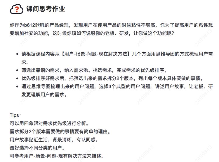 我们在课程中的每个章节下,都设置了相应的实战训练作业,这些作业均来自一线互联网公司的真实案例,会在最大程度上与真实工作场景相切合,希望能借此帮大家更好的掌握产品人的诸多能力。在这里,不妨直接拿出产品P2课程“需求分析”这一章节的作业,供大家参考——