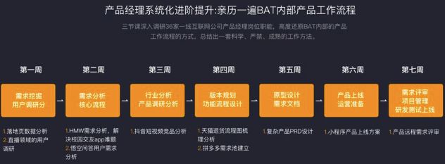 所以三节课的教研团队深入调研了36家一线互联网公司产品经理岗位职能,高度还原了BAT内部的产品工作流程的方式,总结出一套科学、严谨、成熟的工作方法。如下——