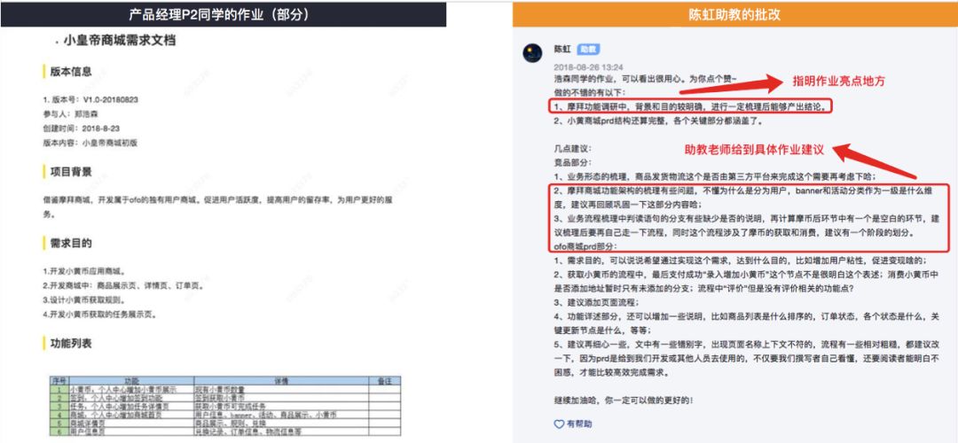 此外,更重要的是在你完成作业之后,会有在知名互联网公司从业2年以上产品的助教老师,帮你1V1批改作业,给你实时反馈,保证你的学习效果。具体来看,如下图: