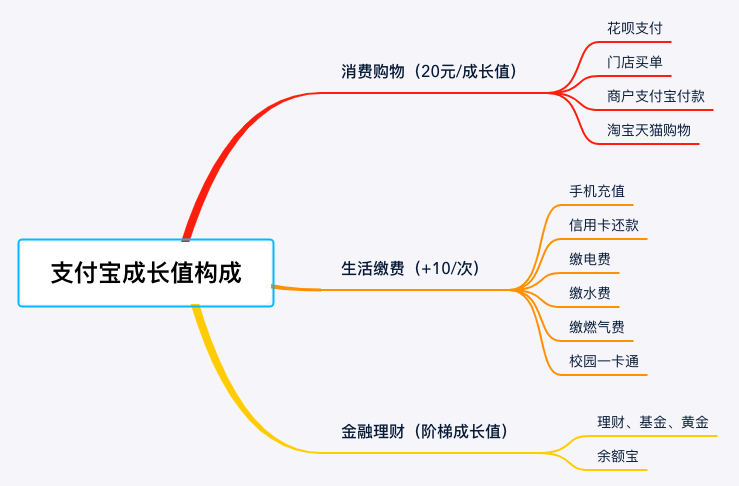 支付宝主要的运营动作包括促进用户消费购物、完成生活缴费和增加金融理财。生活缴费任务的成长值奖励较高,可以推测占据用户生活支付场景是主要运营方向。