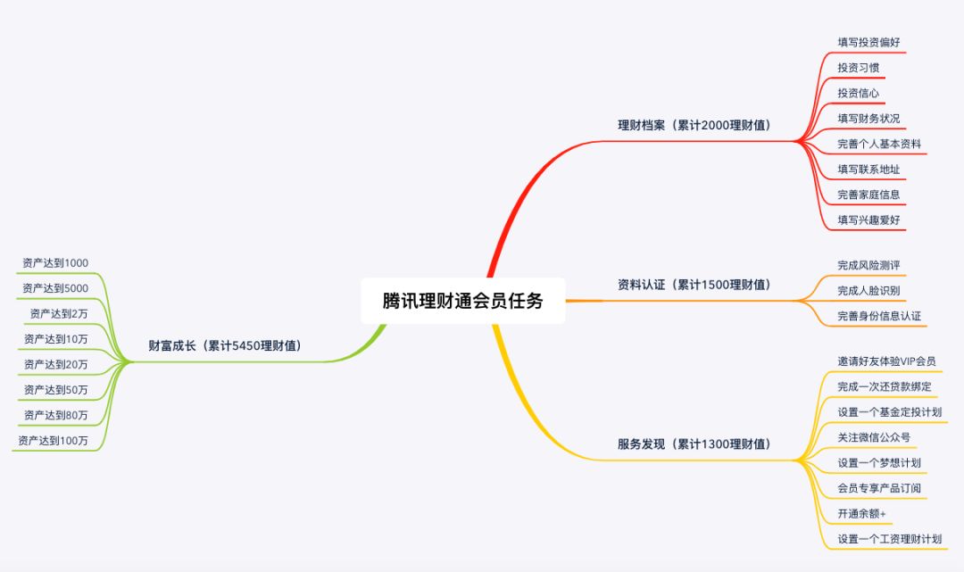 腾讯理财通的主要运营动作包括促进用户购买理财、激励用户完善个人信息。腾讯理财通的会员任务多达27个,收集用户信息的任务占到1/3,可见完善用户画像为产品的主要战略。