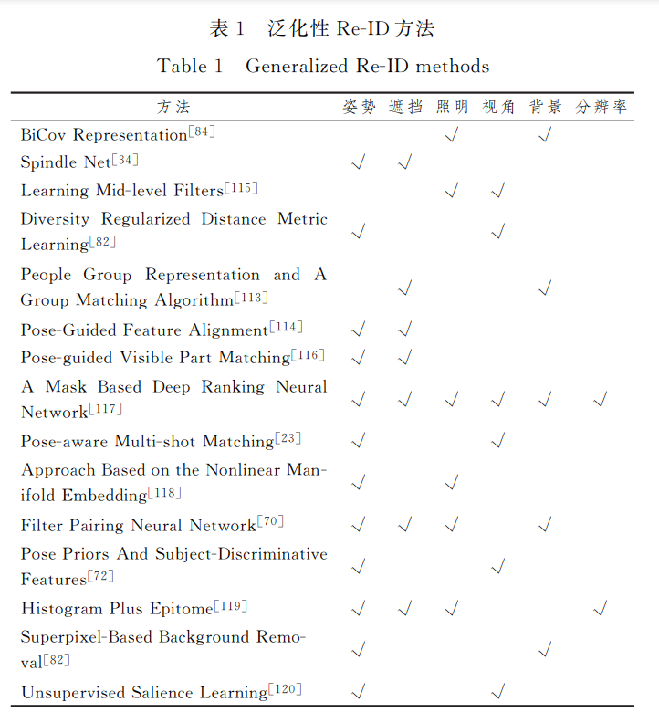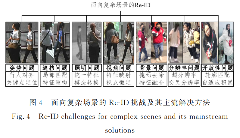 (1) 首次以复杂场景中存在的实际挑战为分类依据,将 2010-2021年期间发表的 ReGID 论文按问题主导类型进行分类, 主要包括行人姿势变化、目标遮挡、照明差异、视角差 异、背景变化、图像分辨率差异以及开放性问题,如图4所示.