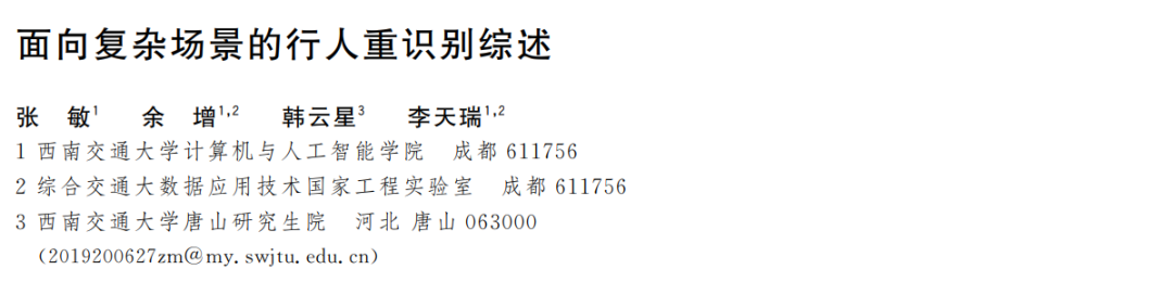 行人数据来源于异时异地的不同设备,存在不同程度的 行人姿势变化、目标遮挡、照明差异、视角差异、背景变化、设 备像素差异以及开放性问题等,给 ReGID 研究带来了巨大的 挑战.下文简析 ReGID领域出现以上挑战的原因.(1)姿势变化问题. 由于同一行人多张图片存在拍摄时 间差,而且行人在不间断地运动,导致多张同一行人图像数据 间存在姿势差异. (2) 目标遮挡问题. 摄像镜头与目标行人之间存在障碍 物,导致目标 行 人 在 照 片 或 视 频 中 表 现 出 身 体 局 部 缺 失 的 问题.(3)照明变化问题.由于多张行人图像的拍摄时间和地 点不同、拍摄设备对颜色的敏感度不同,因此会出现天色明暗 变化和照明差异等,导致行人图像的色彩差异大.(4)视角变化问题.由于摄像设备架设的高度不统一、摄 像头可以进行一定角度的旋转等,导致行人图像的拍摄视角 出现垂直方向上从平视到俯视的不同、水平方向上从正视到 侧视的不同.(5)背景问题. 不同摄像设备架设的地理位置不同,导致 拍摄到的行人图像背景有差异;同一台摄像设备偏转不同角 度拍摄,同样会导致图像的背景差异;除此之外,两张图像拍 摄时光照、天气不同也会造成图像背景的差异性.(6)分辨率问题. 不同摄像设备像素差异导致拍摄的行 人图像分辨率不同;相同摄像设备架设高度不同也会影响分 辨率,例如架设高则拍摄范围大,在成像中越靠近边缘位置的 目标越小,经剪裁放大后分辨率越低.(7)开放性问题. 开放性问题主要包括除以上6个主要 影响外的其他相关小问题,如服装更换的问题、黑衣人问题以 及数据问题等.对于在服装问题上进行的 ReGID 研究,在实 验阶段默认行人短期服装不变,实际应用中 ReGID 所采集的 数据源一般时间跨度较大,行人服装会产生较大变化且深色 衣物较难进行特征提取;较新颖的 ReGID 研究点被提出时存 在数据集中数据量不足、大量数据标注错误,以及标准数据集 中数据类型不足以满足特殊问题的实验开展等问题.