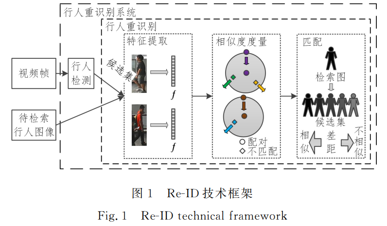 行人重识别是计算机视觉领域的研究热点之一,旨在研 究不重叠的多个摄像区域间对于特定行人的匹配准确率,是 图像检索的子问题[1],多应用于安防和刑侦.我国实现的视 频监控“天网”,就是通过在人流量大的公共区域密集安装监 控设备来实现“平安城市”建设.尽管部分摄像头可转动,但 仍存在监 控 盲 区 和 死 角 等 局 限 性 问 题,ReGID 技 术 弥 补 了摄像设备的视觉局限性.然而,在实际应用中,异时异地相同 行人的图像数据,在姿势、前景背景、光线视角以及成像分辨 率等方面差异较大,使得 ReGID研究具有挑战性. 图1给出了 ReGID 技术框架,描绘了 ReGID 的实现流程 和关键技术.ReGID 技术主要包括特征提取和相似度度量, 具体为:对监控视频帧进行检测和剪裁操作形成候选集,再与 待检索行人 图 像 进 行 对 比,最 后 根 据 相 似 度 排 序 得 到 匹 配 结果.