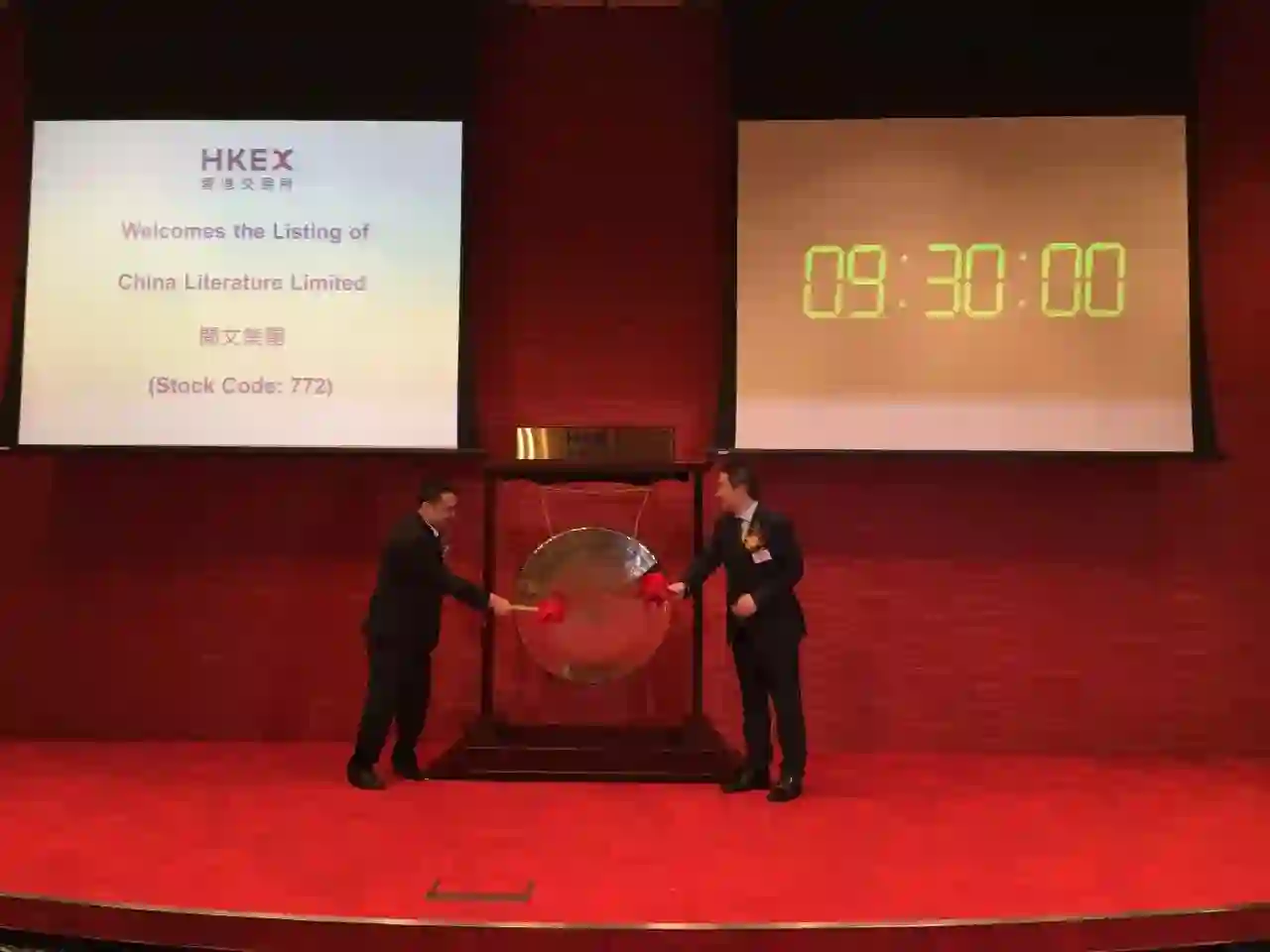 今天上午,香港交易所,阅文集团联席CEO吴文辉、梁晓东一起敲响了开市喜锣。