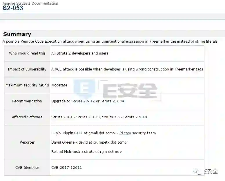 E安全9月12日讯 Apache Struts 9月7日发布安全公告,披露Apache Struts 2存在中危远程代码执行漏洞(S2-053),编号为CVE-2017-12611,当在Freemarker标签中使用表达式常量或强制表达式时使用请求值可能会导致远程代码执行漏洞(见下面的示例)。