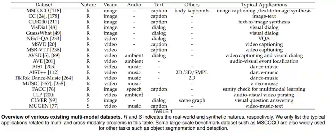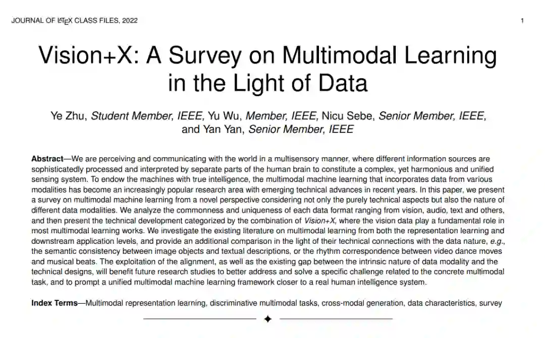 我们以多感官的方式感知世界,与世界交流,不同的信息源经过人脑不同部位的复杂处理和解释,构成一个复杂而和谐统一的感知系统。为了赋予机器真正的智能,融合不同模态数据的多模态机器学习近年来随着技术的不断进步,成为一个日益热门的研究领域。本文从一个新的角度对多模态机器学习进行了综述,不仅考虑了纯技术方面,而且还考虑了不同数据模态的性质。我们分析了从视觉、音频、文本等各个数据格式的共性和独特性,然后以视觉+X的组合分类介绍了技术发展,其中视觉数据在大多数多模态学习工作中发挥着基础作用。我们从表征学习和下游应用两个层面研究了现有的多模态学习文献,并根据它们与数据本质的技术联系进行了额外的比较,例如,图像对象和文本描述之间的语义一致性,或视频舞蹈动作和音乐节拍之间的节奏对应关系。这种对齐的开发,以及数据模态的内在本质与技术设计之间存在的差距,将有助于未来的研究,更好地解决与具体多模态任务相关的具体挑战,并促进统一的多模态机器学习框架更接近真实的人类智能系统。