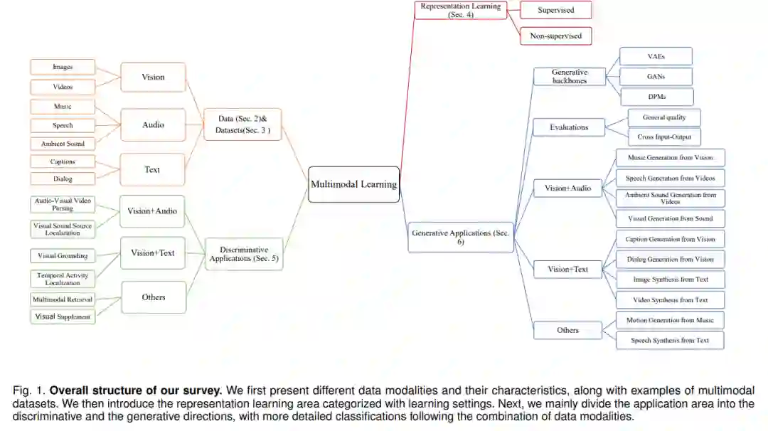 本文的总体结构如下: 在第2节中,首先从不同模态的数据特征方面进行了分析,包括视觉、音频、文本和运动表示。在第3节中介绍了多模态数据集,包括模态属性及其适用的多模态下游任务。然后,我们继续在第4节中介绍多模态表示学习,主要根据它们的学习设置进行分类。在第5节和第6节中,分别提出了具有判别式和生成式任务的具体多模态应用。除了任务和技术介绍之外,我们还做了额外的努力,将现有的文献与第2节中提到的数据特征联系起来,揭示在特定的方法和模型中处理和处理哪些数据属性。上述回顾构成了我们在第7节讨论现有挑战和未来可能方向的基础。第8节包括最后的评论和结论。其主要结构也如图1所示。