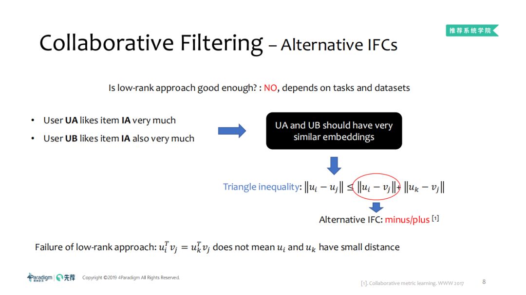 WWW2017上给出了一个简单的协同滤波函数,比如这个UA非常喜欢A物品,UB同样很喜欢A物品,那么UA和UB的相似度很可能是很高的,但是对于low-rank而言,因为u
