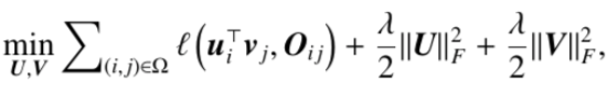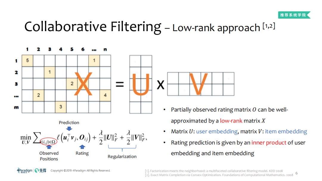 让我们回到推荐系统开始爆发的元年,那一年有两个重要的工作广受关注,第一个是推荐系统应用层面的C++,另一个是数据统计分析。那么这两个工作做了什么事呢?有一个全面的观测矩阵,把这个矩阵拆成两个矩阵相乘,U就是一个矩阵,整体优化目标是拟合函数,后面有个正则相,OIC是已经观测到的打分,这是一个CF标准的模板, U可以看成用户的向量,V是物品的向量,在做预测的时候使用UV做了内积与推荐目标进行比较,从2008年开始,推荐系统有单独的会议,09年左右是推荐系统的爆发点。