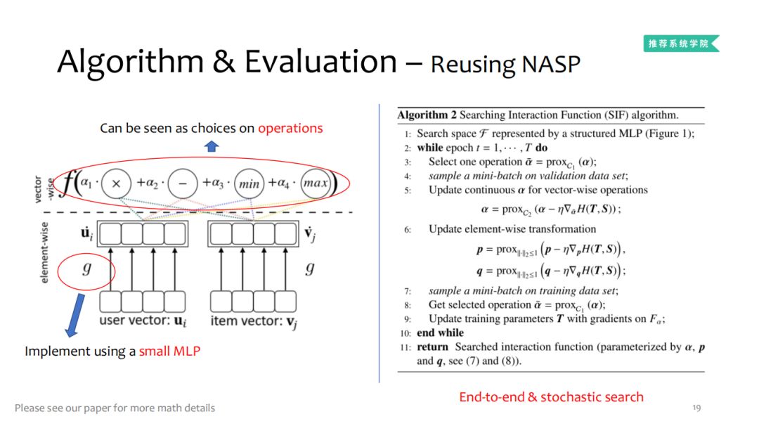 NASP算法逻辑如上图,对于向量层面可以理解为简单的线性代数运算,同时元素映射可以理解为非线性转换,这使得算法可以训练端对端和随机搜索,相比以往我们引入通过限制运算的离散选择,可以极大的改善效率问题同时极大程度上提高效果,有兴趣的朋友可以看看我们的论文。