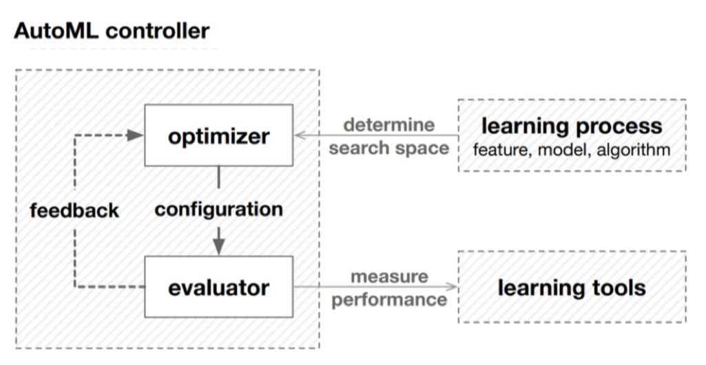 上述三要素在AutoML中对应关系如下:AutoML设计controller,里边包含优化器及评价器。优化器在搜索空间生成更好的候选空间,利用评价器来衡量候选空间的效果,这样反复迭代直至达到结束条件的过程就构成了一个AutoML。